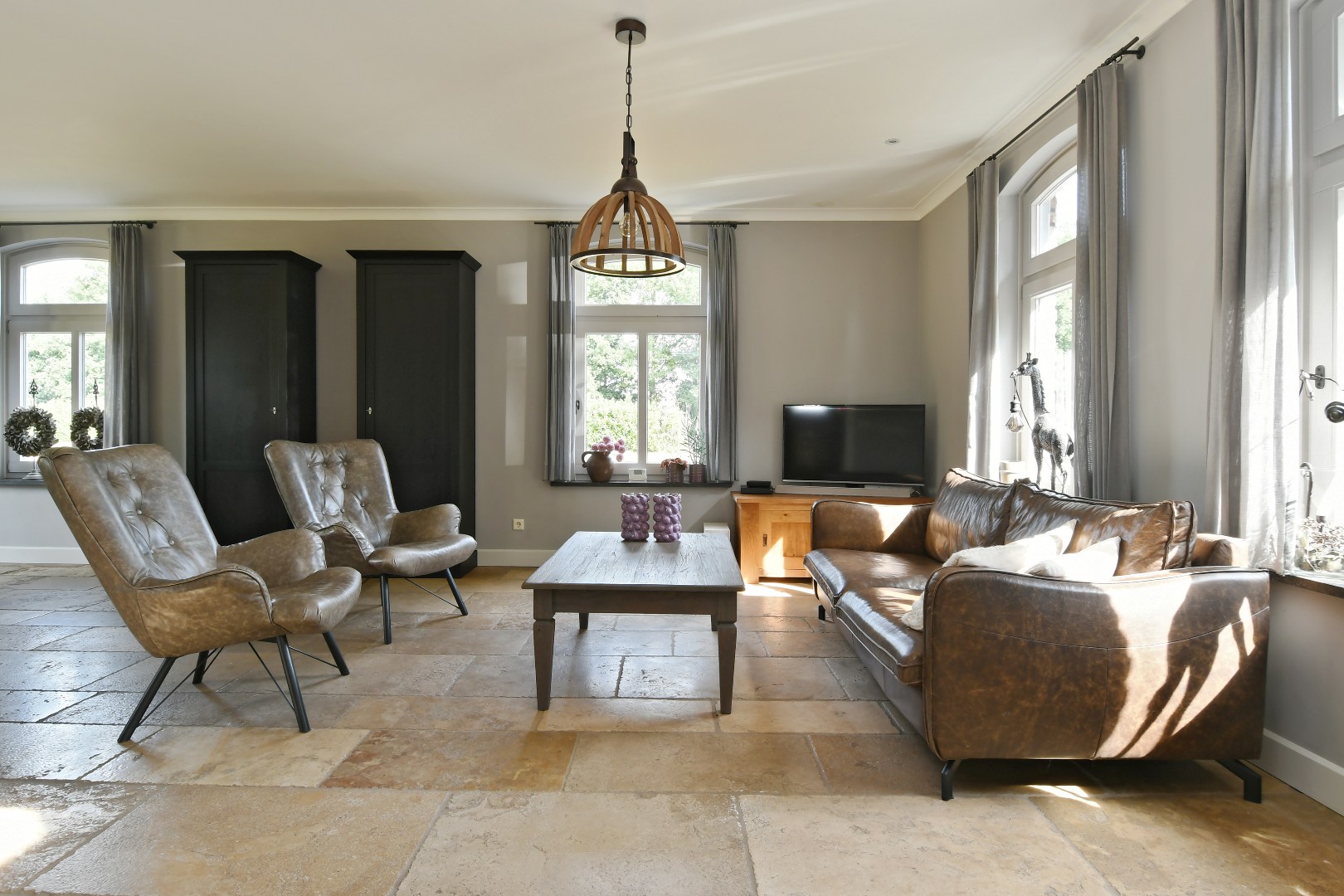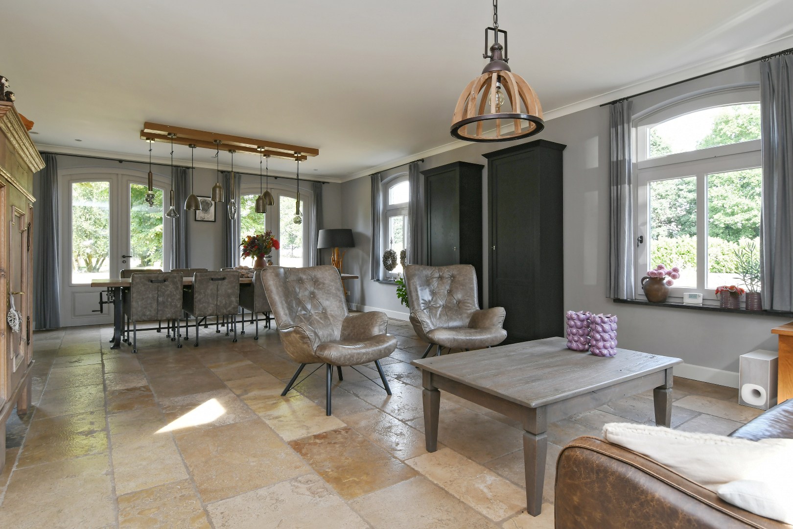 Een ruime en lichte woonkamer aan de rechterzijde is een toonbeeld van wooncomfort. De strak gestucte wanden en de dubbele openslaande deuren creëren een naadloze verbinding met de omliggende tuin.