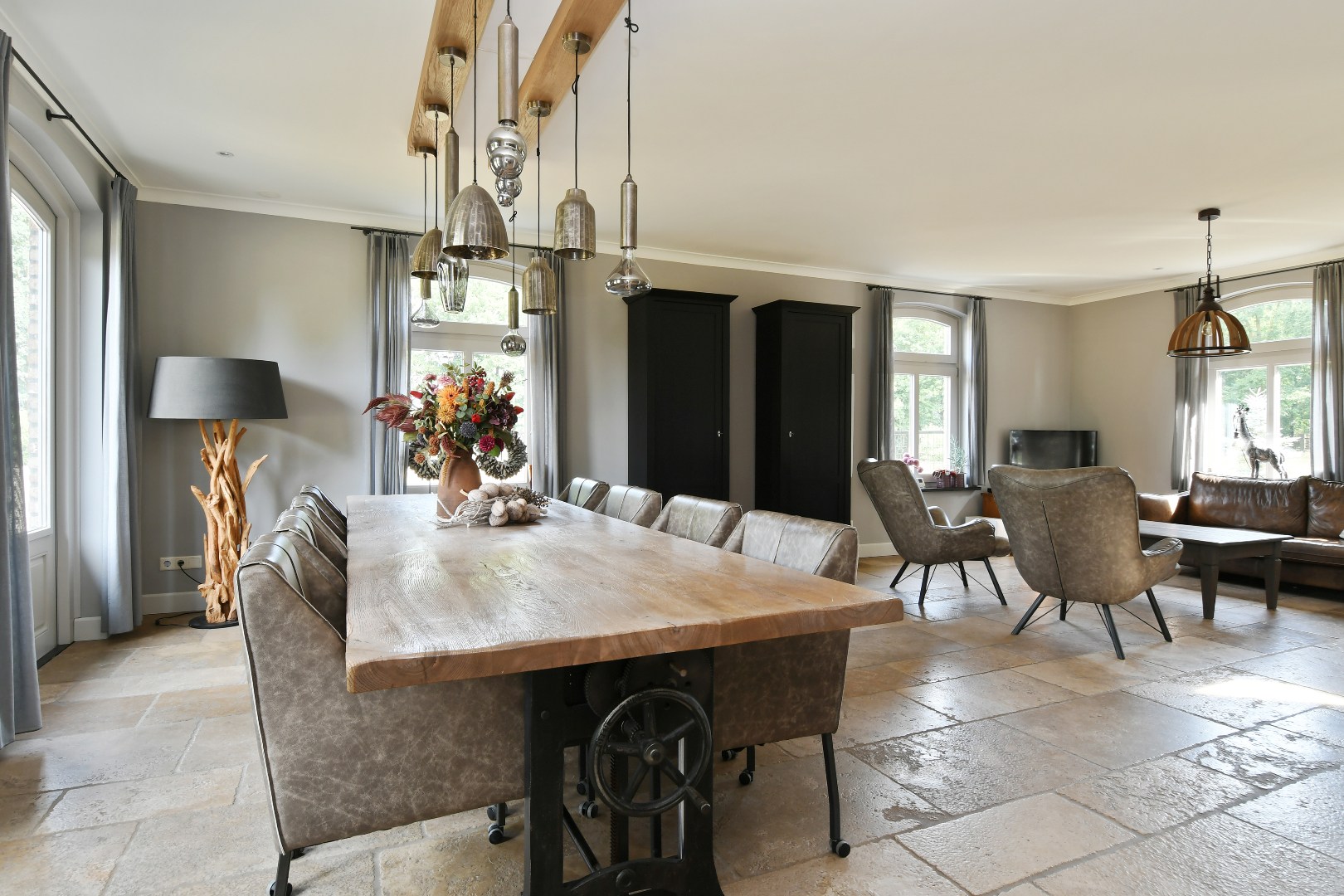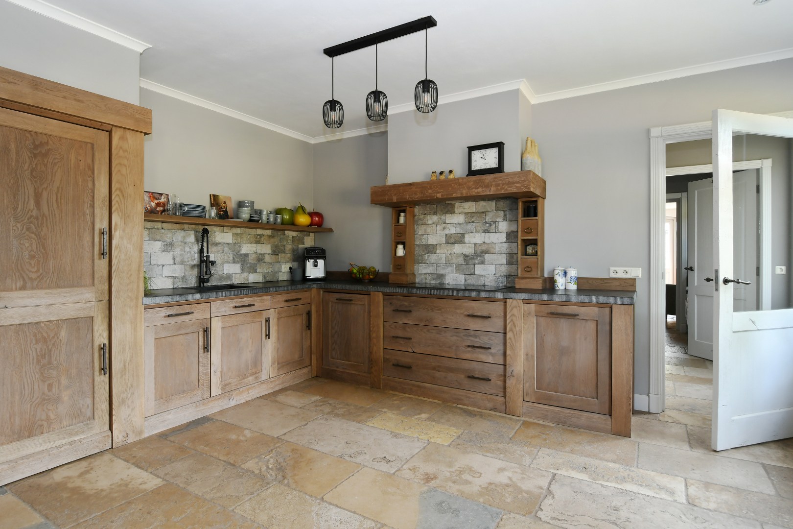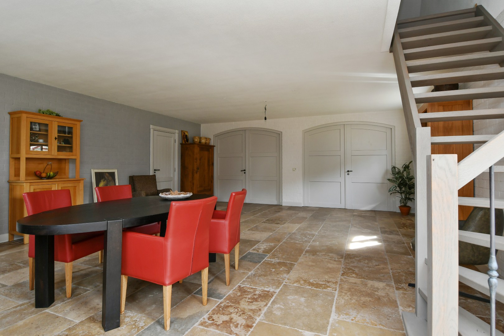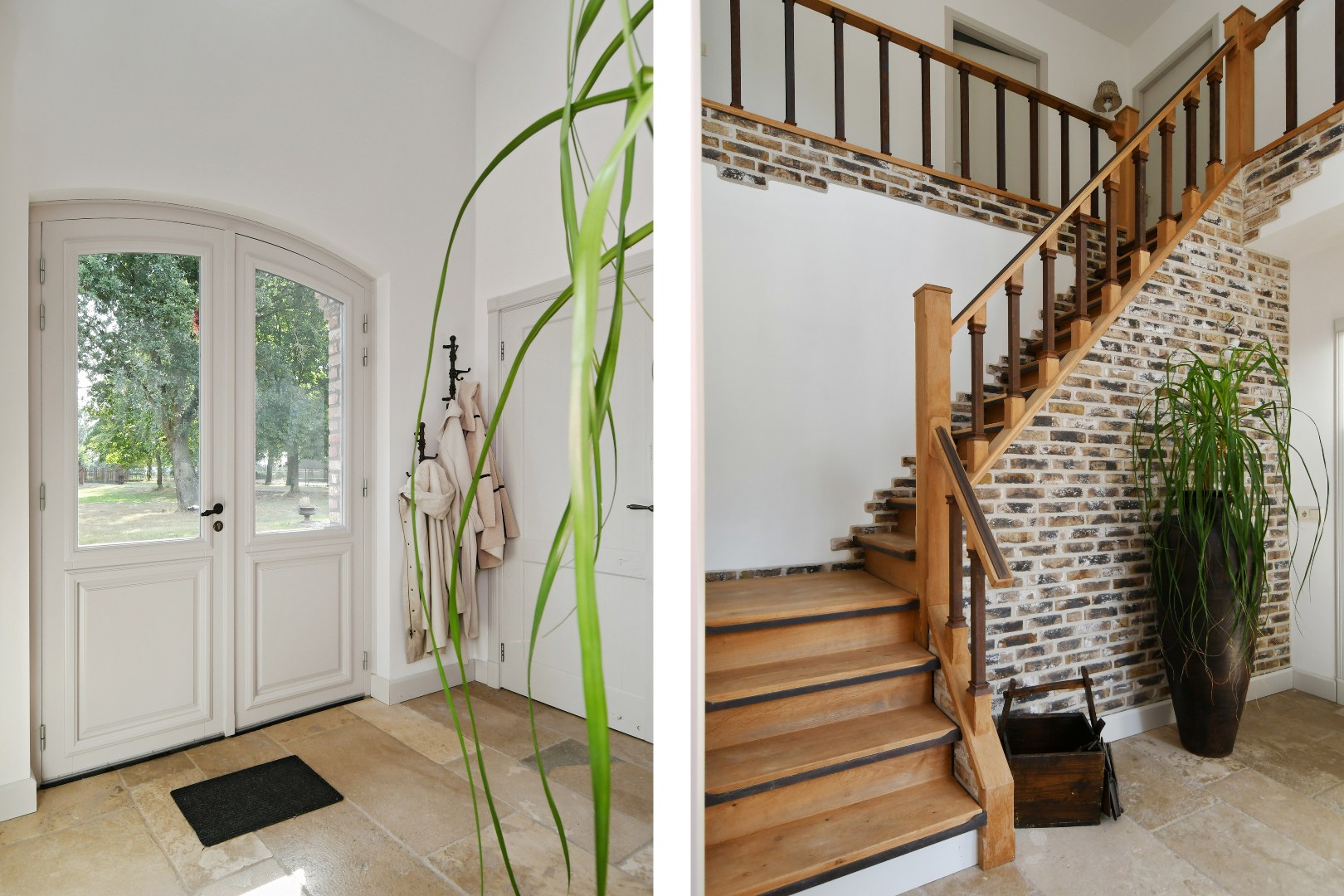 Begane grond: Bij binnenkomst wordt u verwelkomd in een schitterende ontvangsthal met een imposante vide en een handgemaakte eikenhouten trap die direct een gevoel van grandeur geeft. De gehele begane grond is drempelloos voorzien van een exclusieve Franse Dallen natuurstenenvloer met comfortabele vloerverwarming, die de landelijke sfeer perfect complementeert. De rustieke, massief eiken binnendeuren versterken dit gevoel van authenticiteit en kwaliteit.