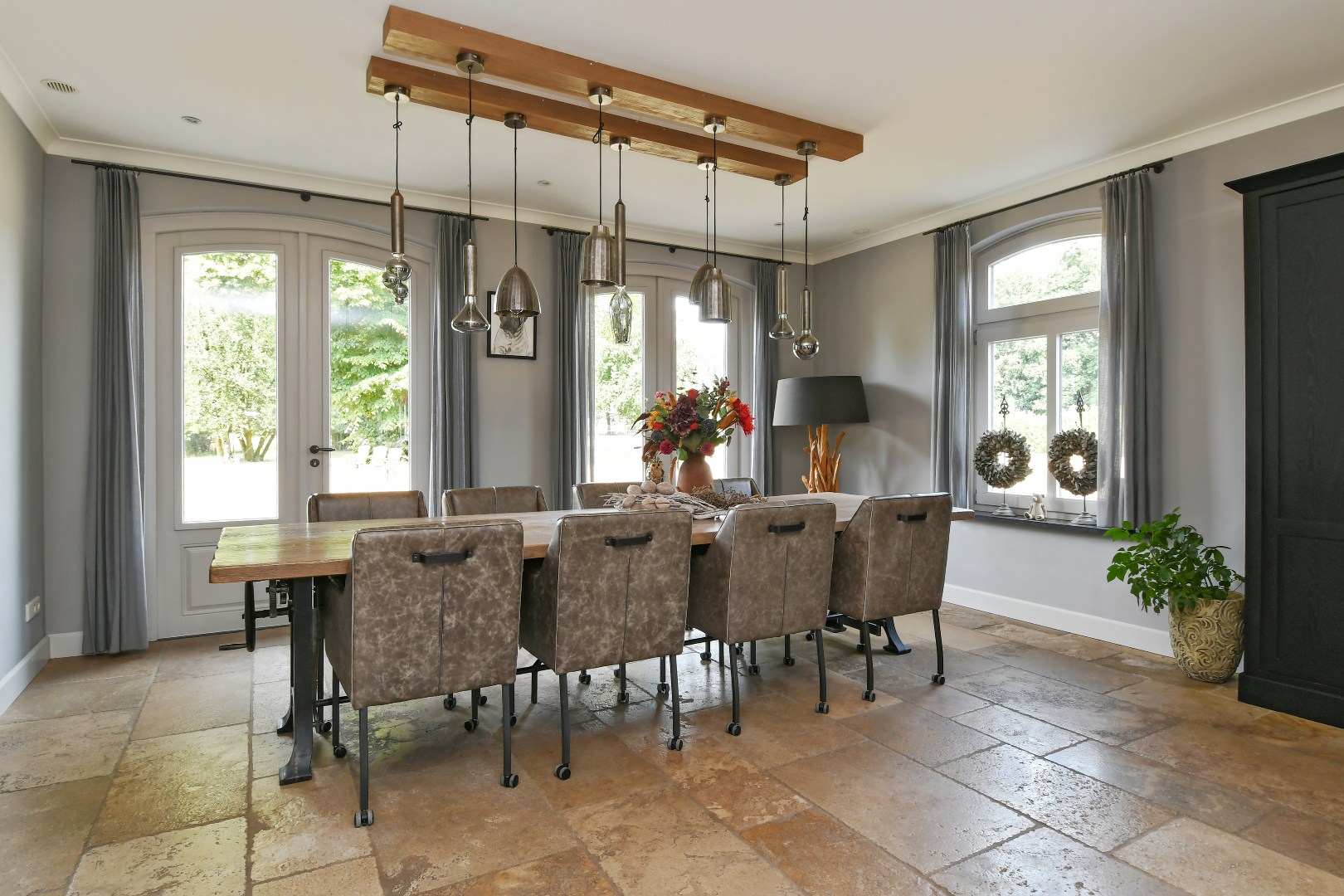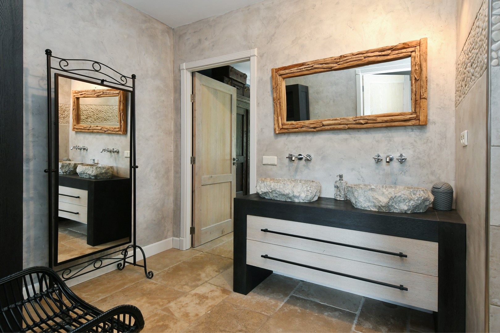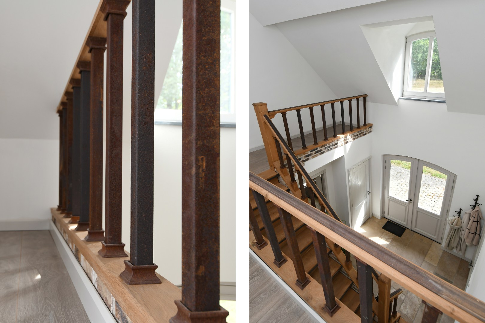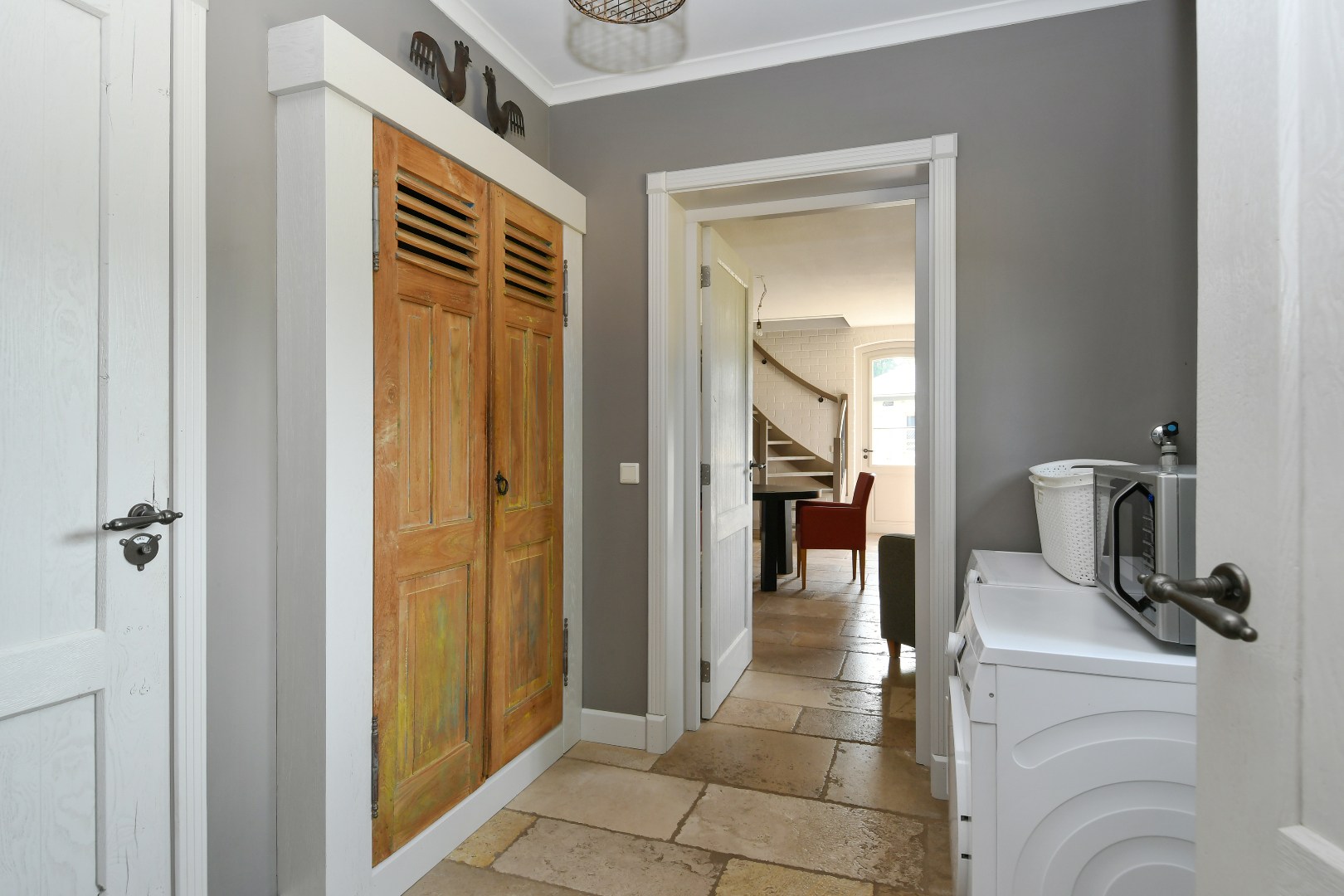 Begane grond: Bij binnenkomst wordt u verwelkomd in een schitterende ontvangsthal met een imposante vide en een handgemaakte eikenhouten trap die direct een gevoel van grandeur geeft. De gehele begane grond is drempelloos voorzien van een exclusieve Franse Dallen natuurstenenvloer met comfortabele vloerverwarming, die de landelijke sfeer perfect complementeert. De rustieke, massief eiken binnendeuren versterken dit gevoel van authenticiteit en kwaliteit.