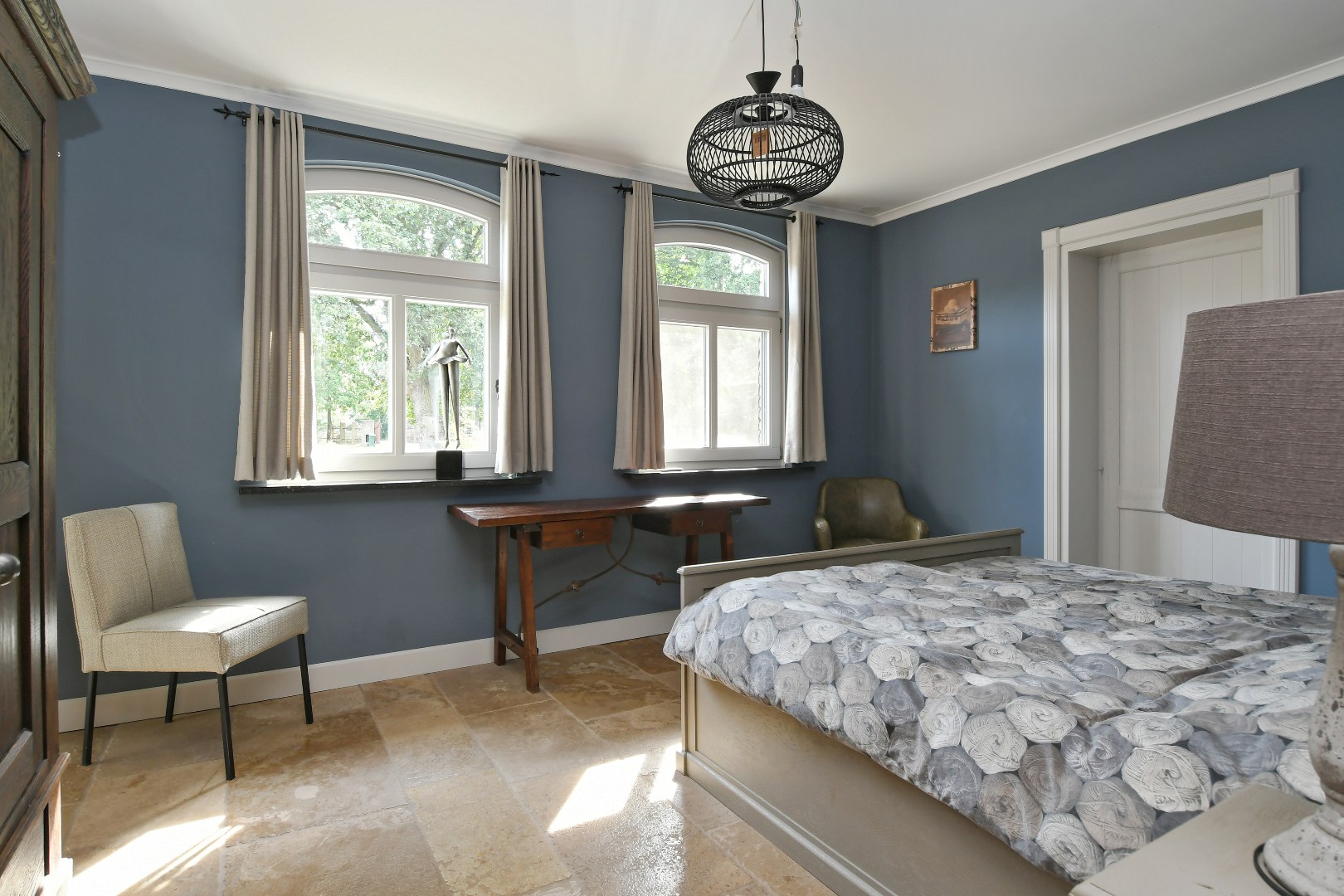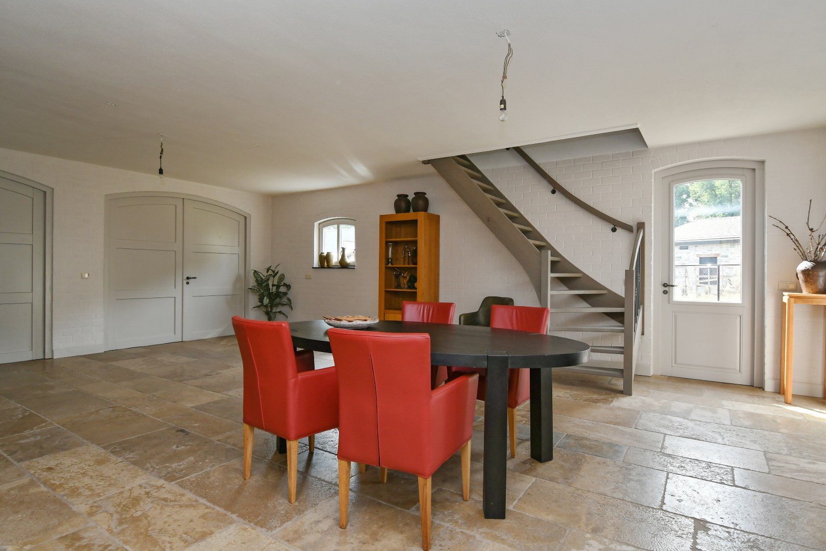De woning beschikt daarnaast over een zeer ruime, inpandige hobbyruimte/garage die voor talloze doeleinden geschikt is (kantoor aan huis, atelier, gastenverblijf). Deze ruimte is eveneens onberispelijk afgewerkt, voorzien van dezelfde natuurstenenvloer en beschikt over een tweede, volwaardige eikenhouten trap naar de verdieping.
