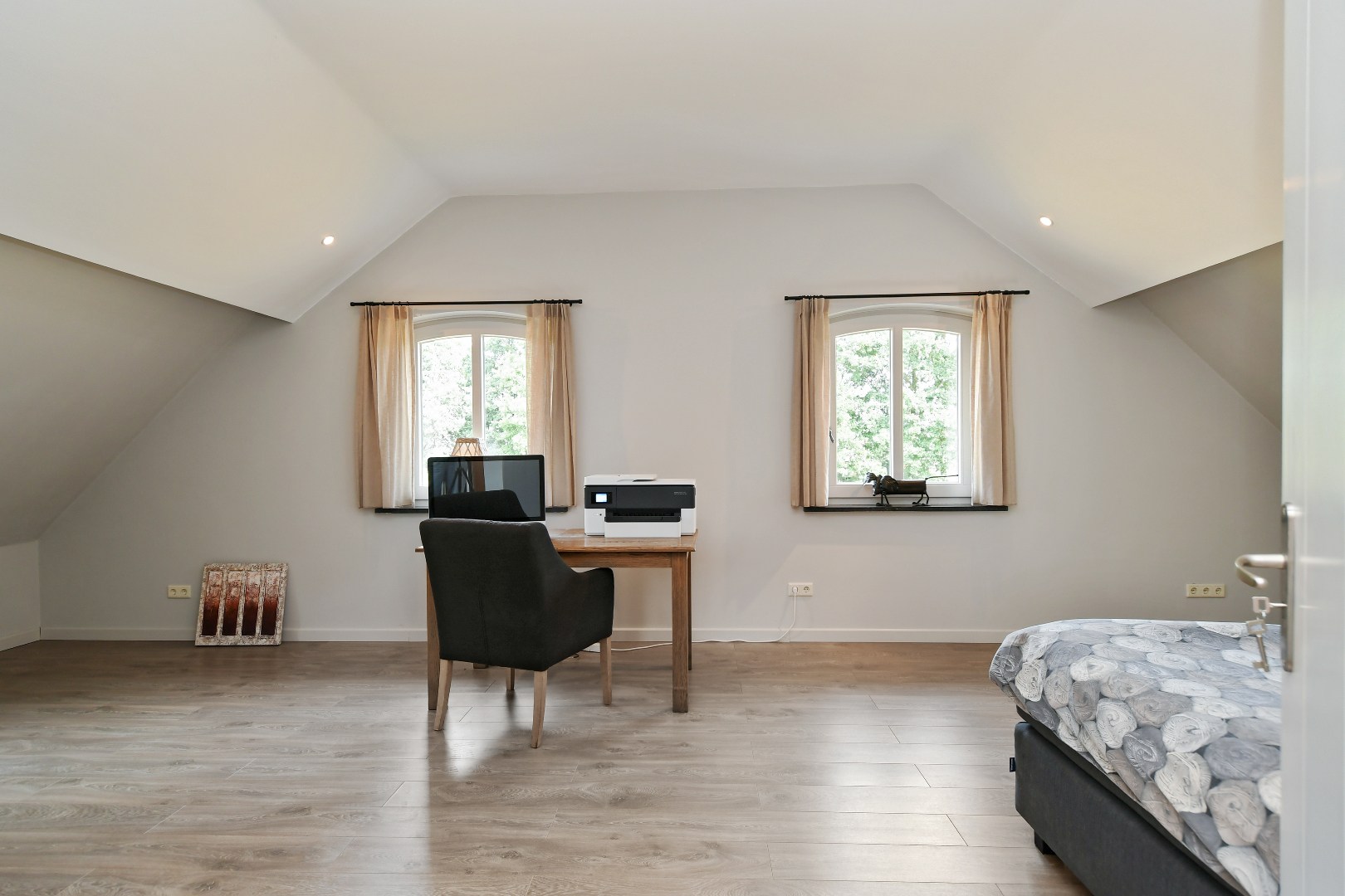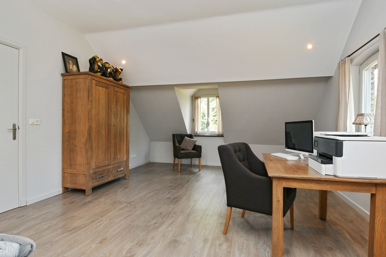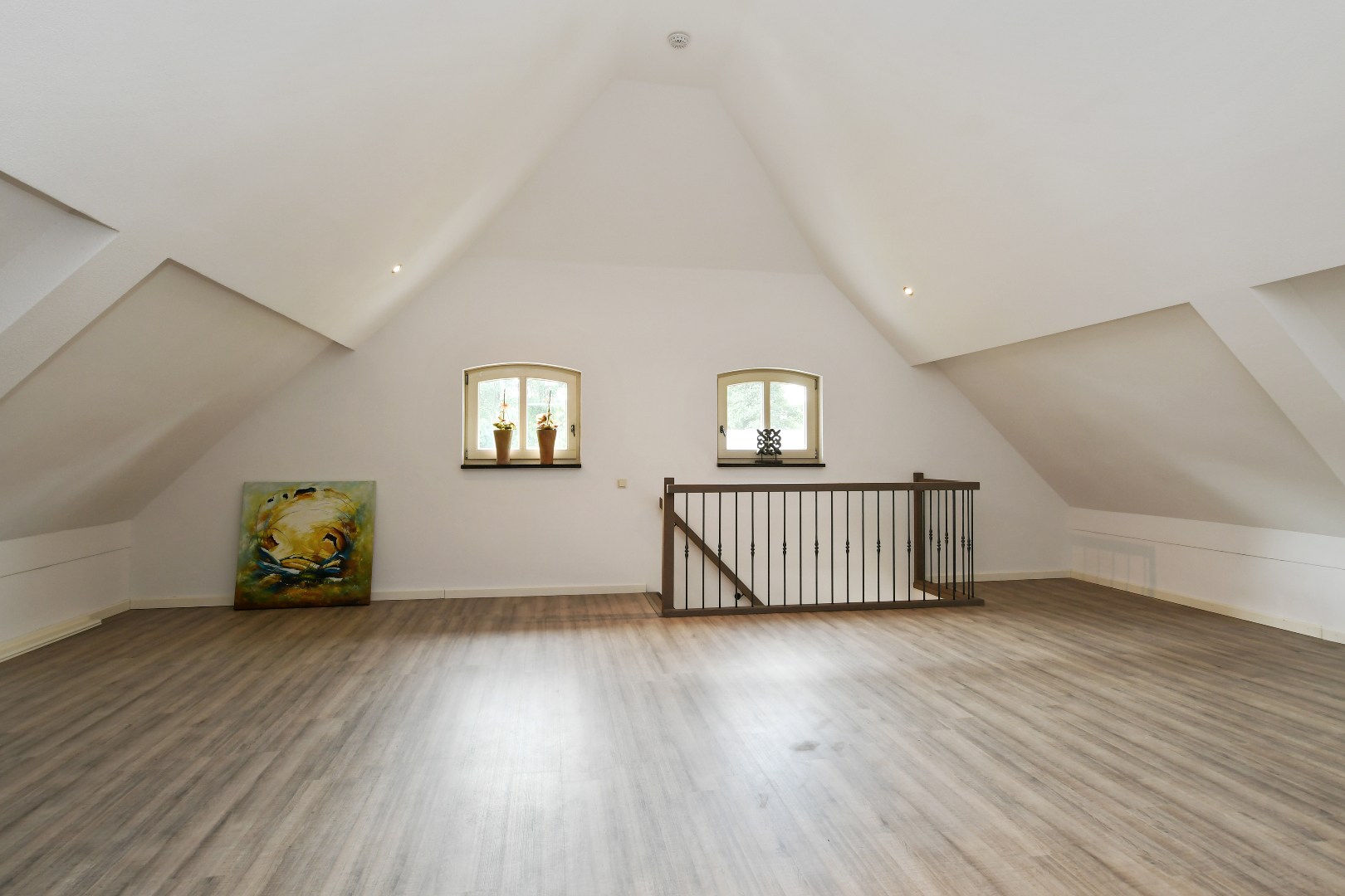 Boven de hobbyruimte bevindt zich nog een grote, multifunctionele kamer die momenteel in gebruik is als atelier.
