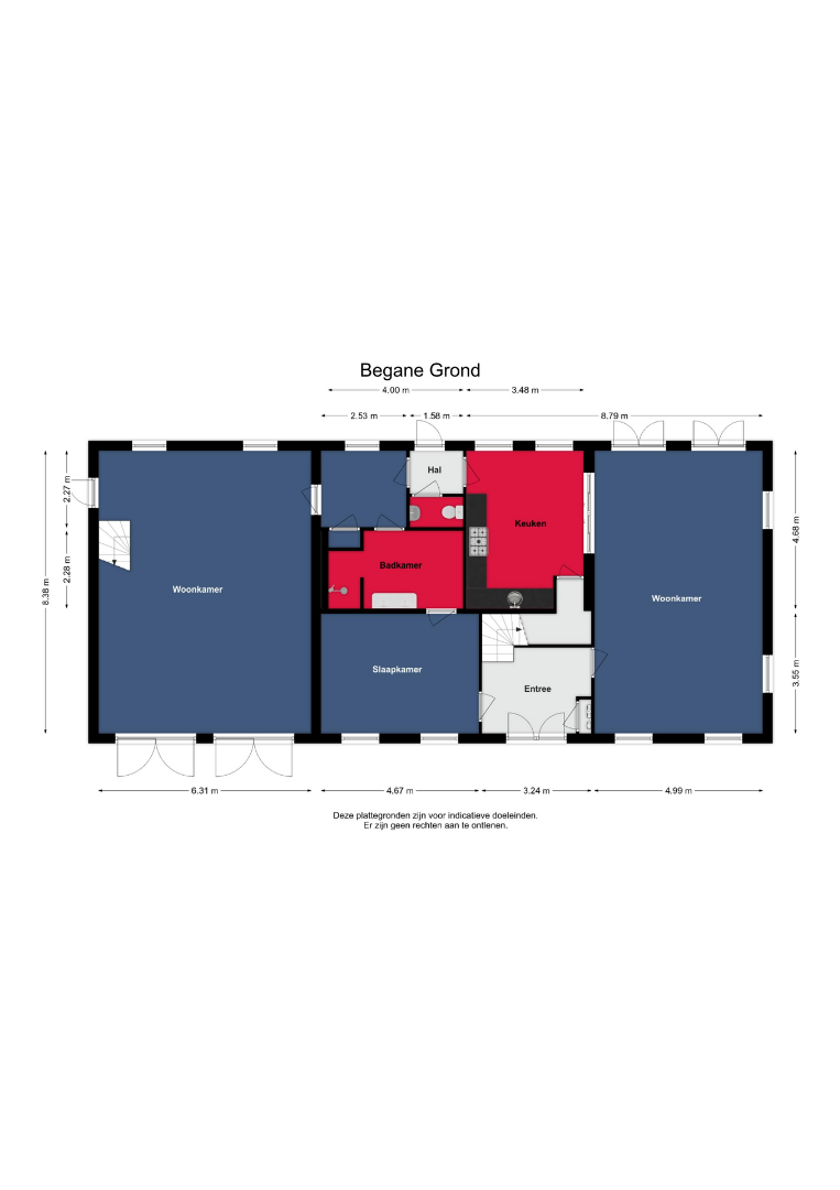 Een ruime en lichte woonkamer aan de rechterzijde is een toonbeeld van wooncomfort. De strak gestucte wanden en de dubbele openslaande deuren creëren een naadloze verbinding met de omliggende tuin.