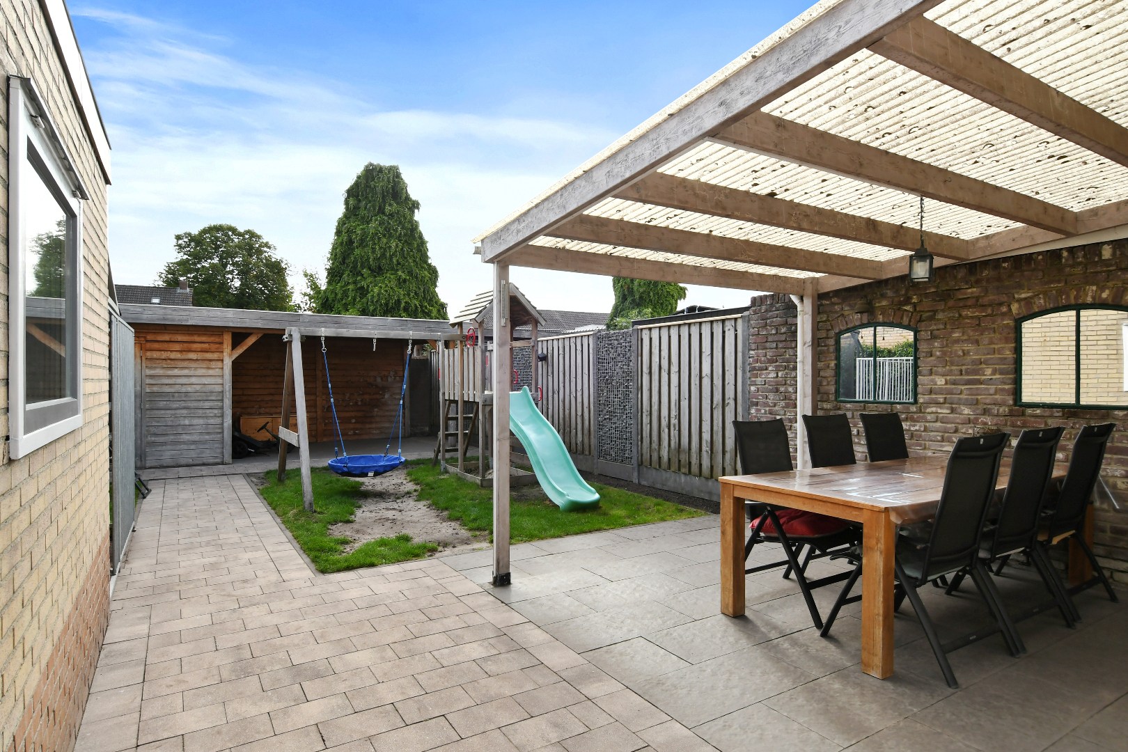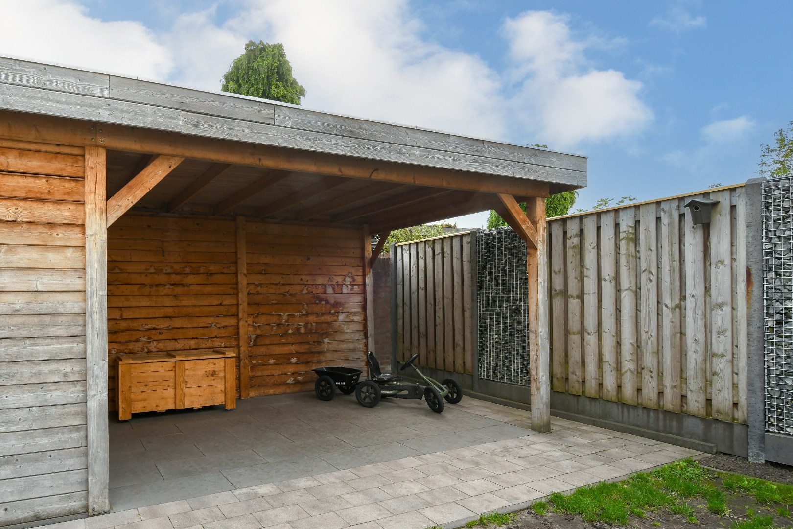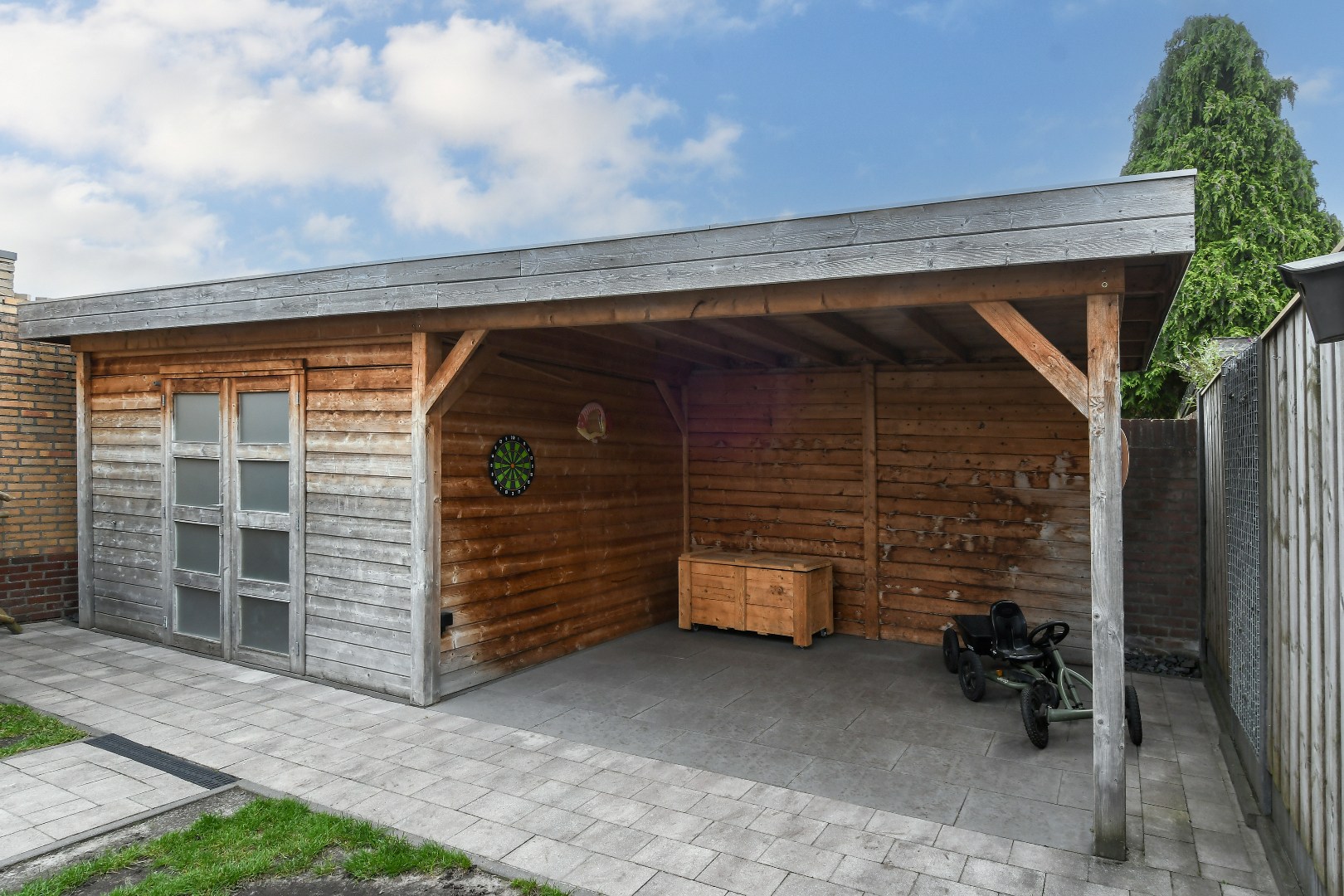 De achtertuin is aangelegd met een gazon, een sfeervolle overkapping, een ideale plek om het hele jaar door te genieten van lange avonden buiten. Achterin de tuin staat een houten tuinhuis met extra overkapping. Dankzij de achterom is de tuin bovendien makkelijk bereikbaar.