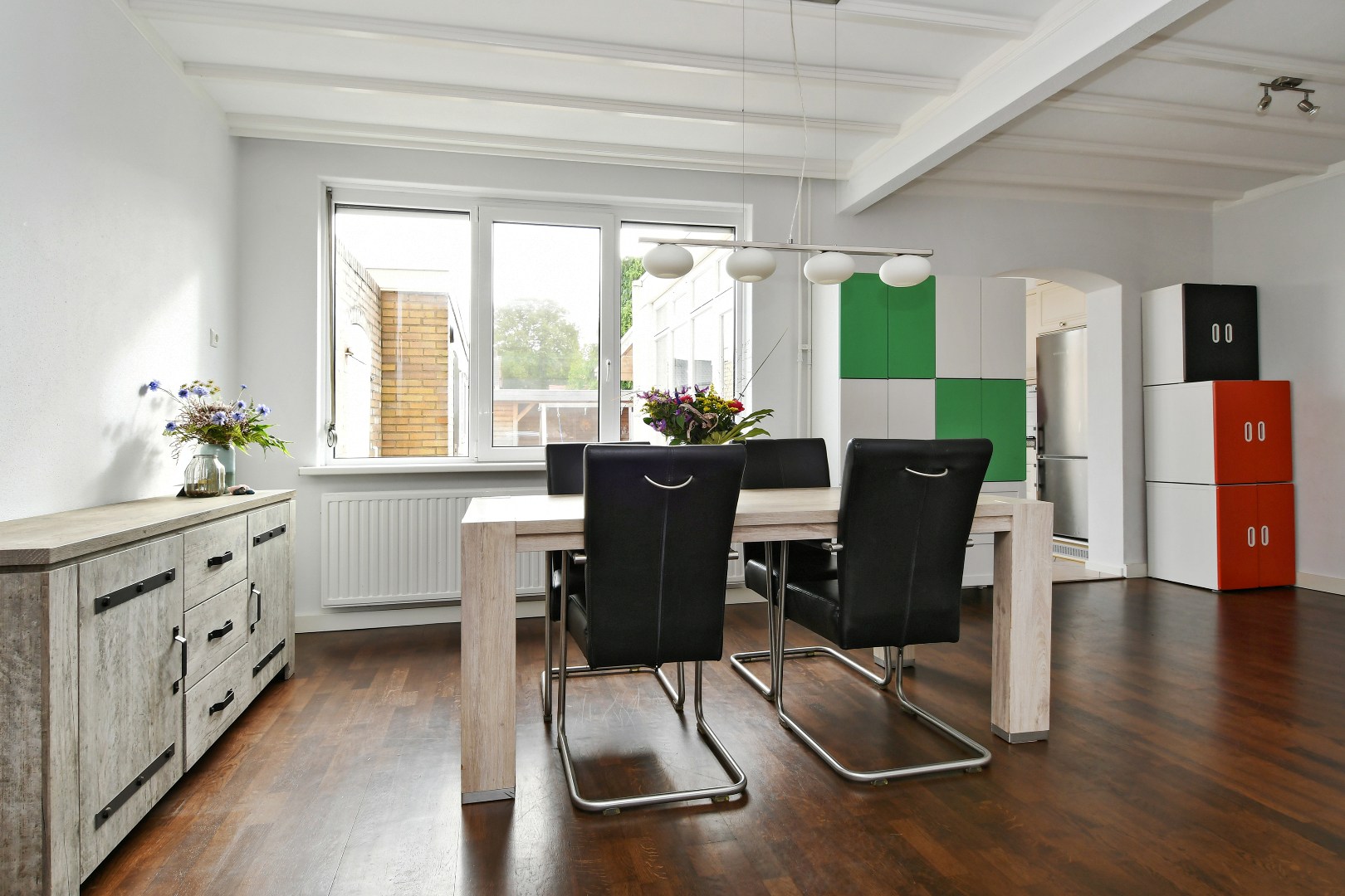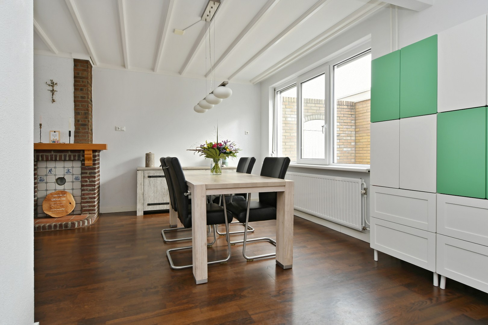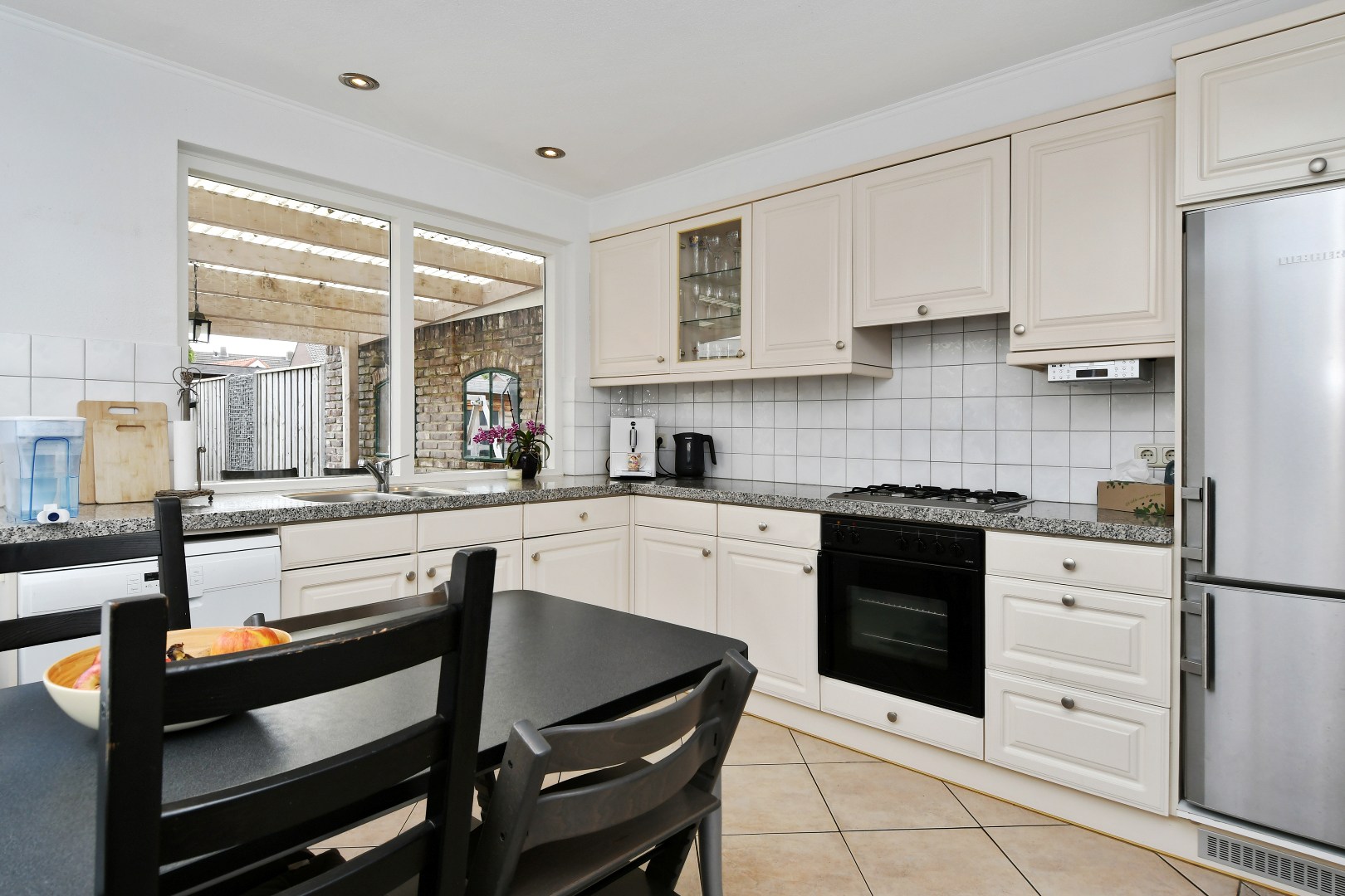De keuken aan de achterzijde is voorzien van inbouwapparatuur en staat door de vele ramen en de achterdeur in directe verbinding met de tuin.