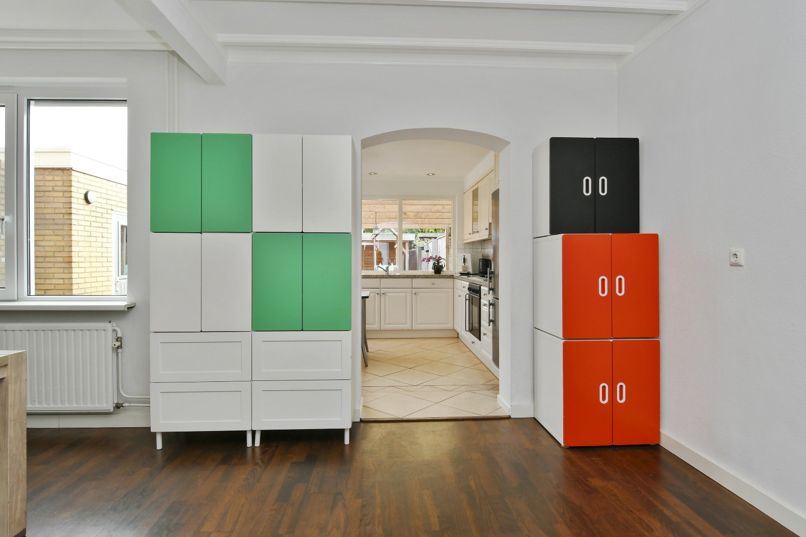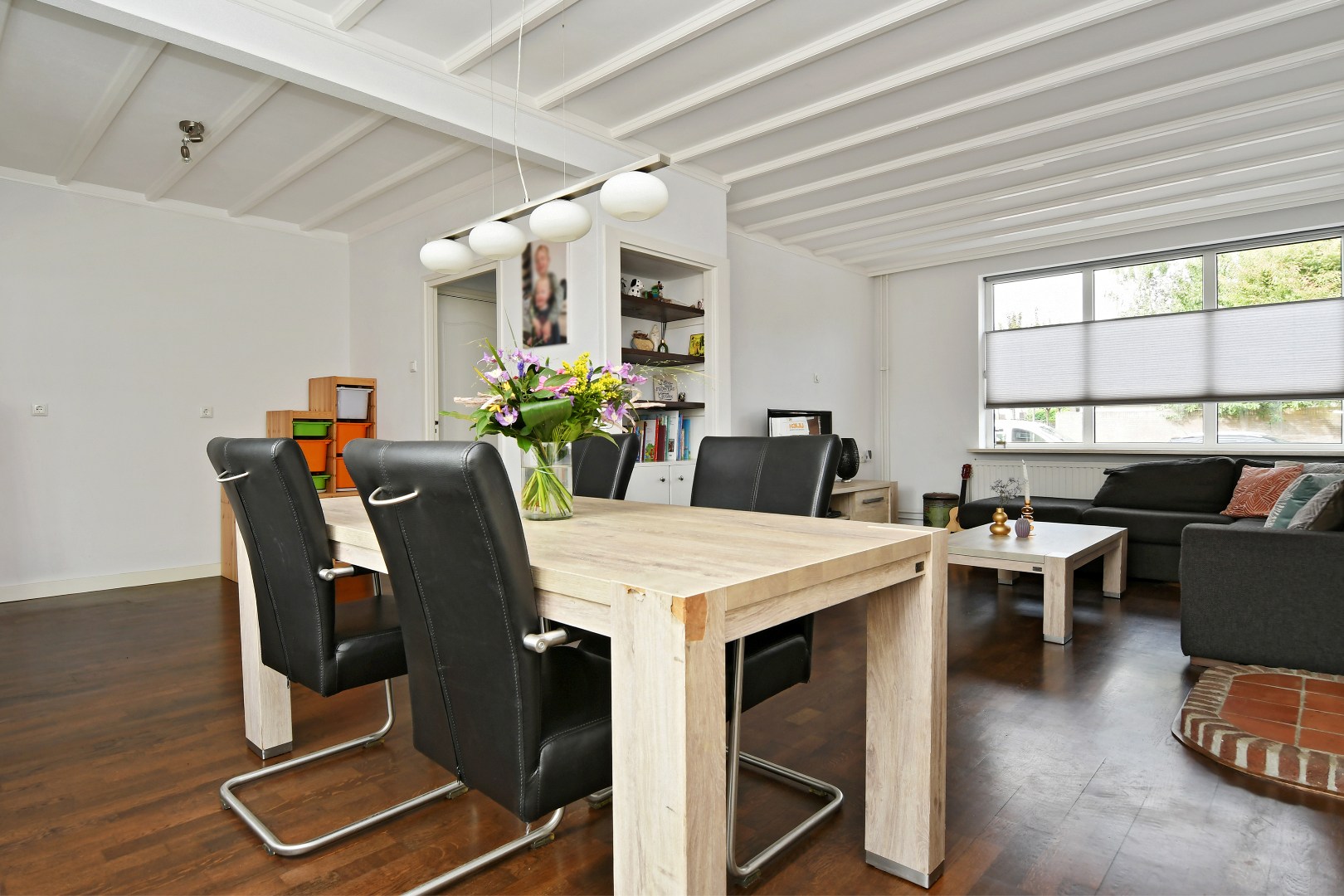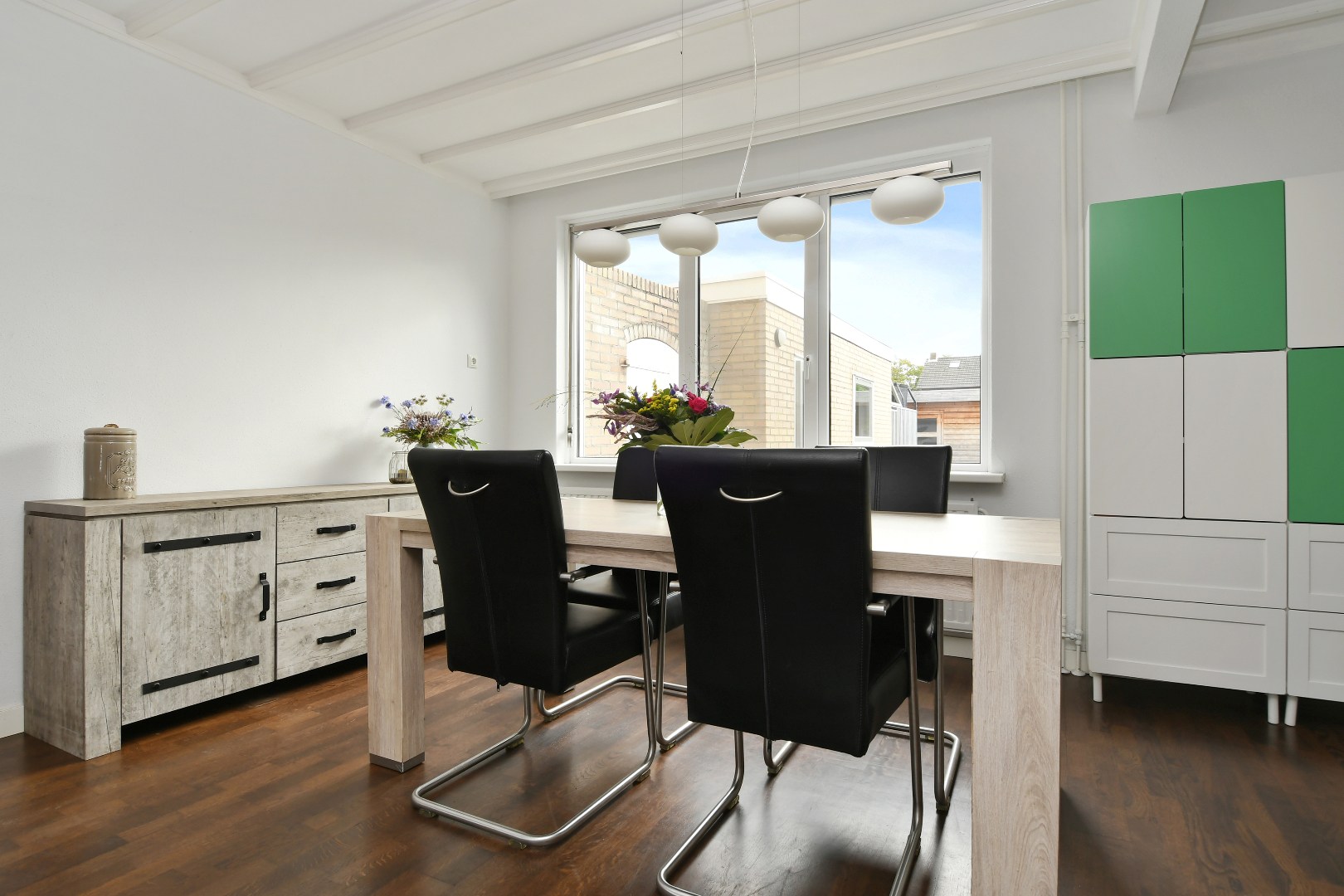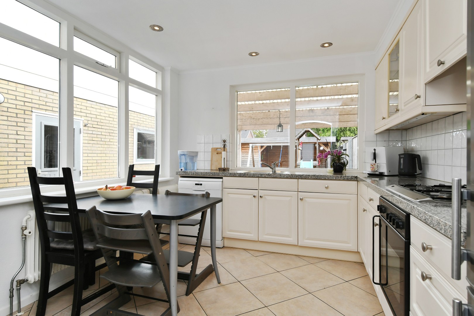De keuken aan de achterzijde is voorzien van inbouwapparatuur en staat door de vele ramen en de achterdeur in directe verbinding met de tuin.