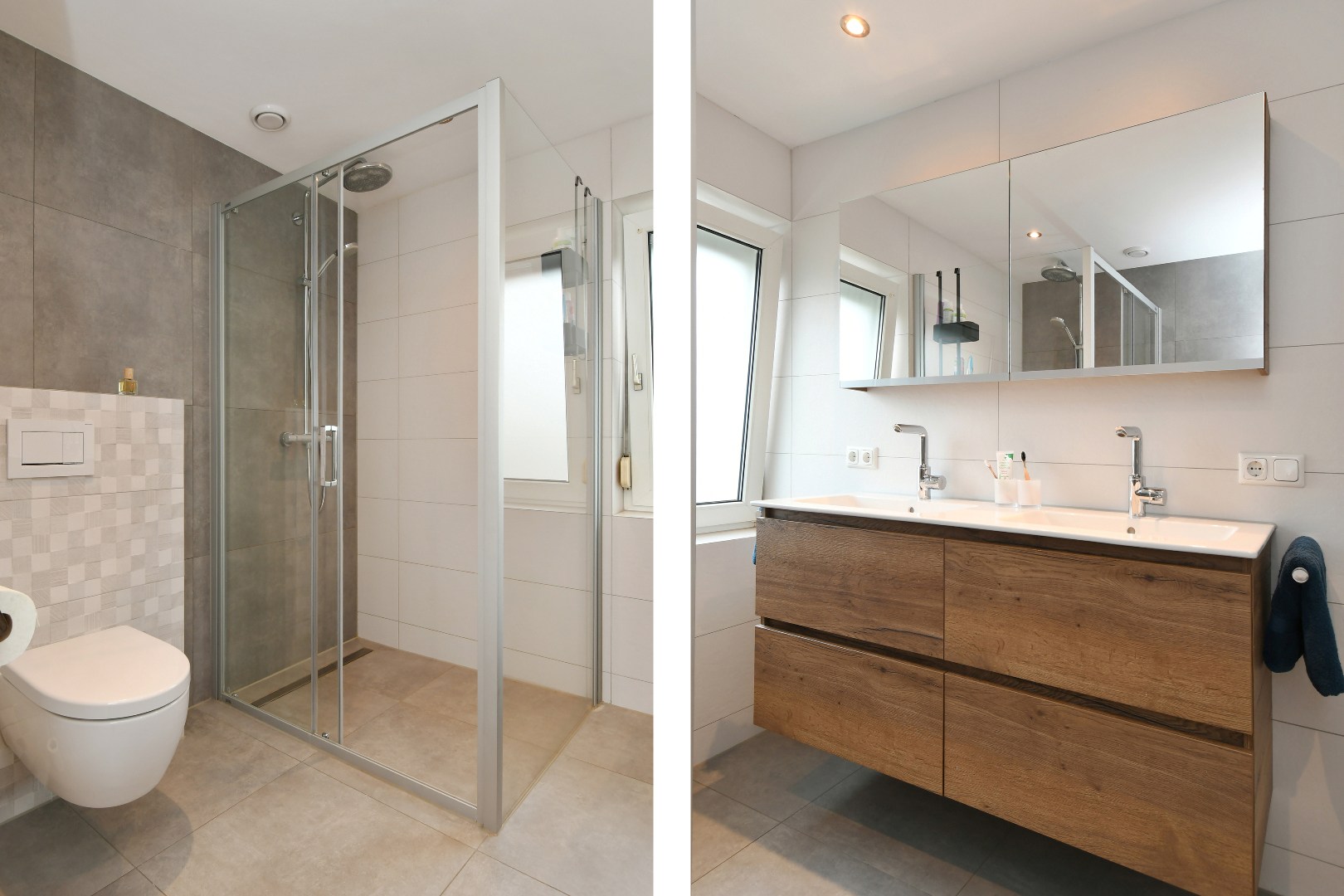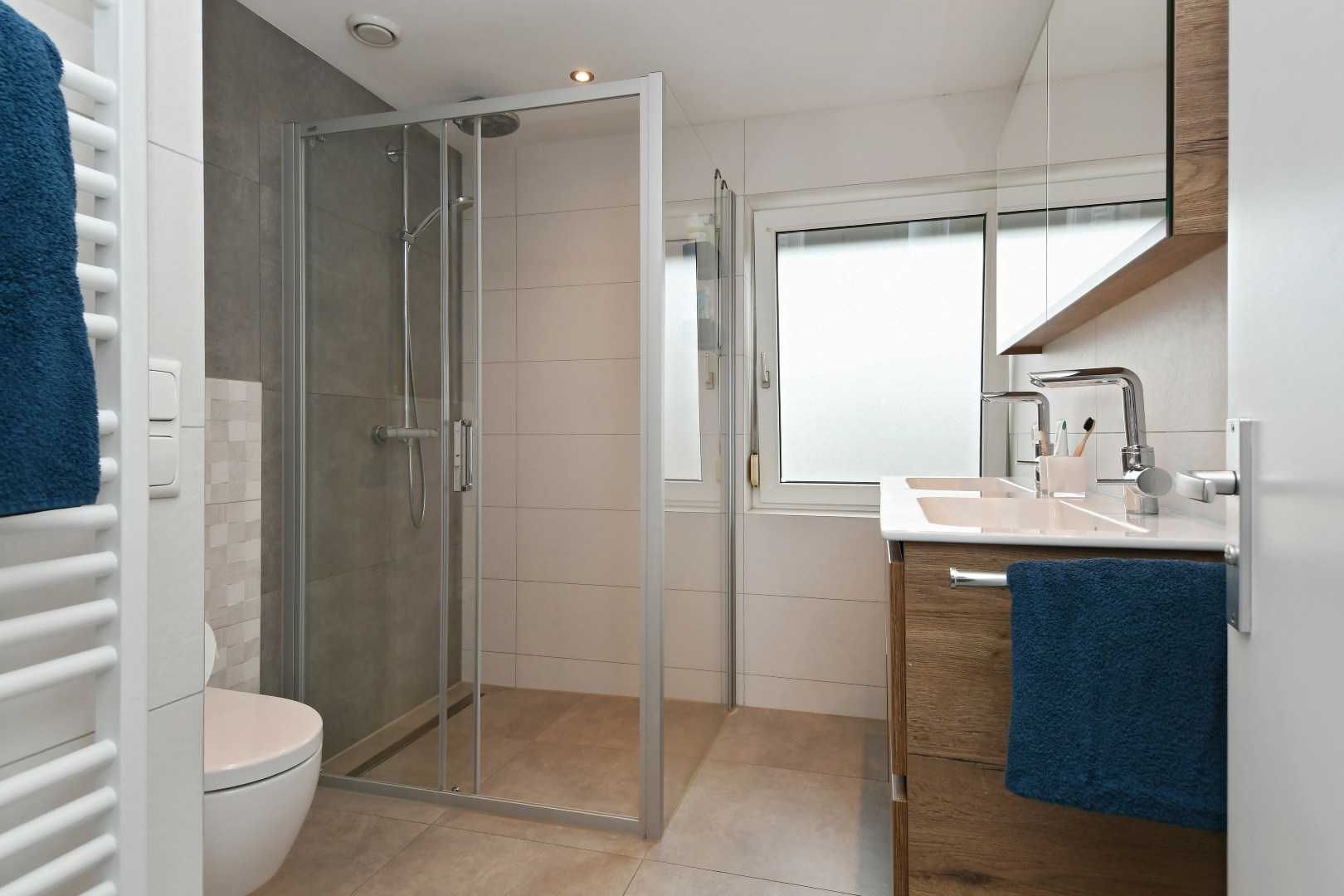 Op de eerste verdieping vind je drie ruime slaapkamers en een moderne badkamer ('21) die van alle gemakken is voorzien. Denk aan een grote inloopdouche, een tweede toilet, een stijlvol badmeubel met dubbele wastafel en een spiegelkast. De vloerverwarming maakt het comfort compleet.