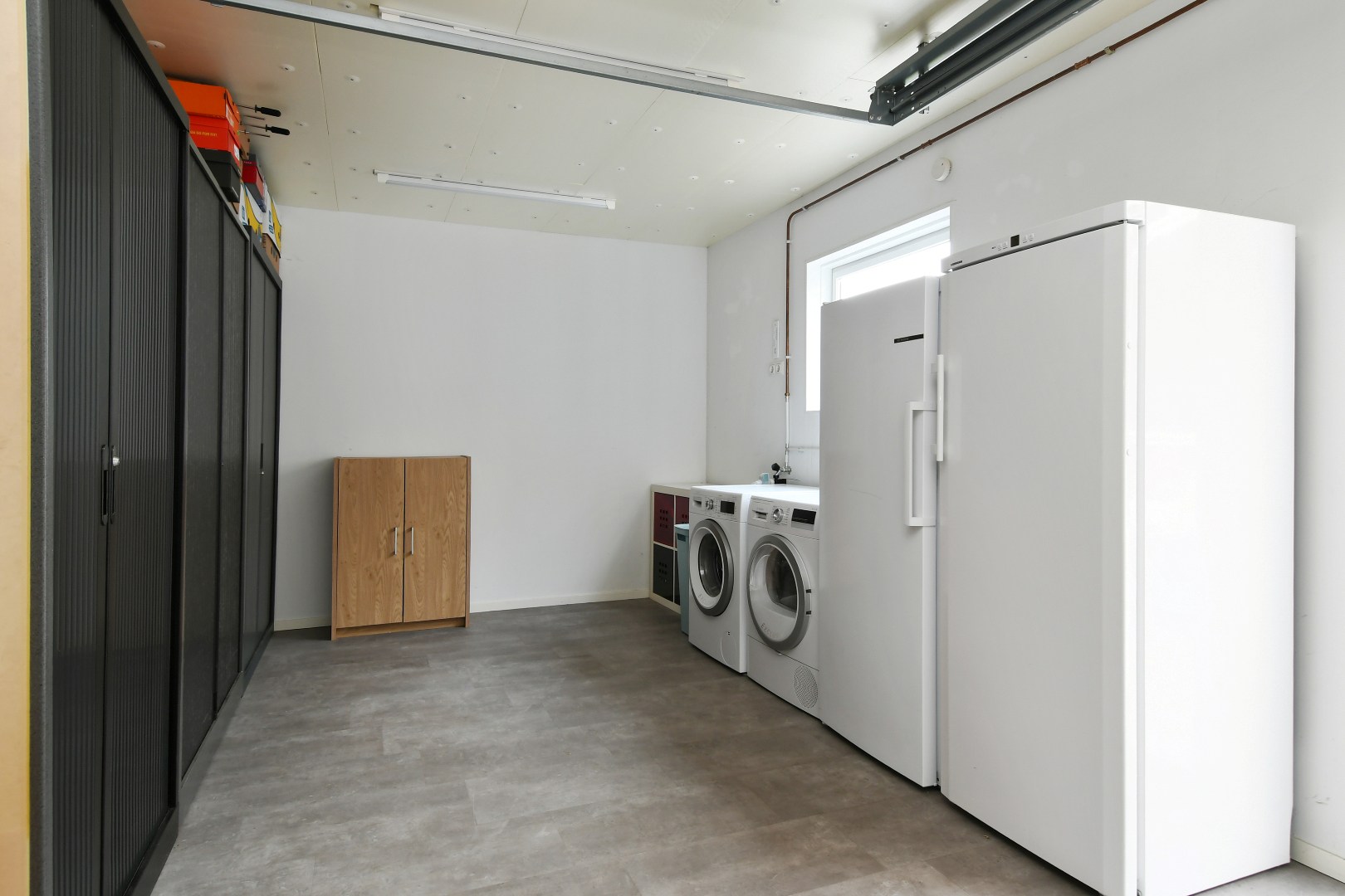 Ook aan praktische zaken is gedacht. De garage is geïsoleerd en voorzien van een sectionaaldeur, een pvc-laminaatvloer en aansluitingen voor wasmachine en droger.
